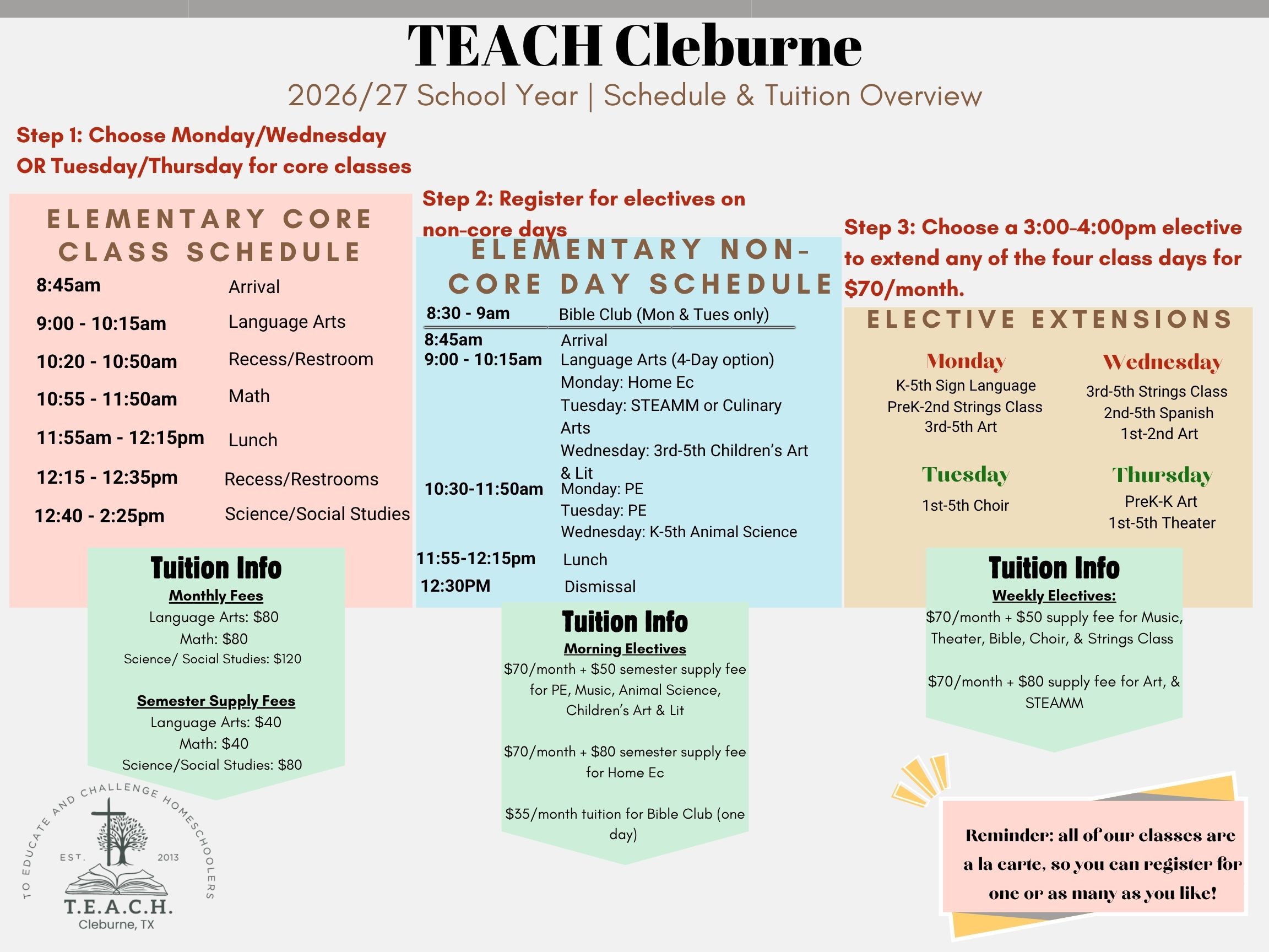 Teachers provide a current list of curriculum and supplies at registration. If you have any questions or concerns, please reach out. We’re happy to find the answer.